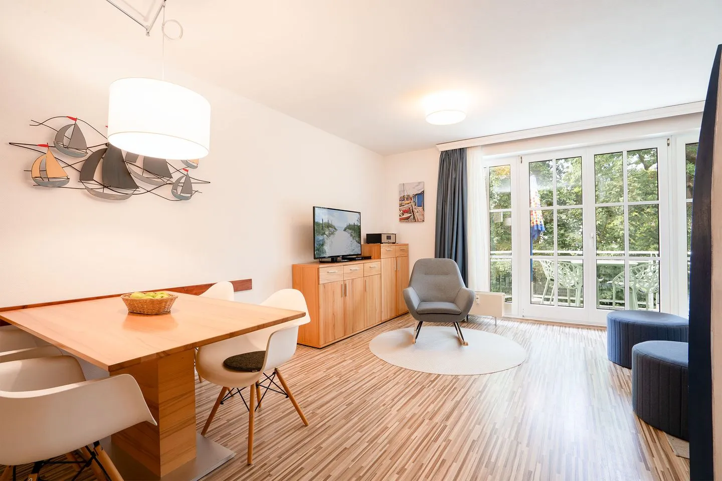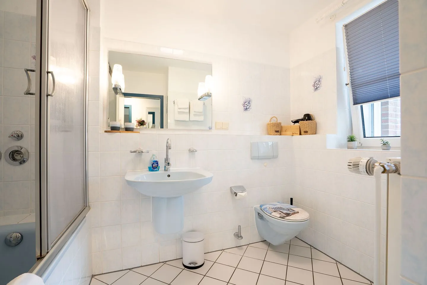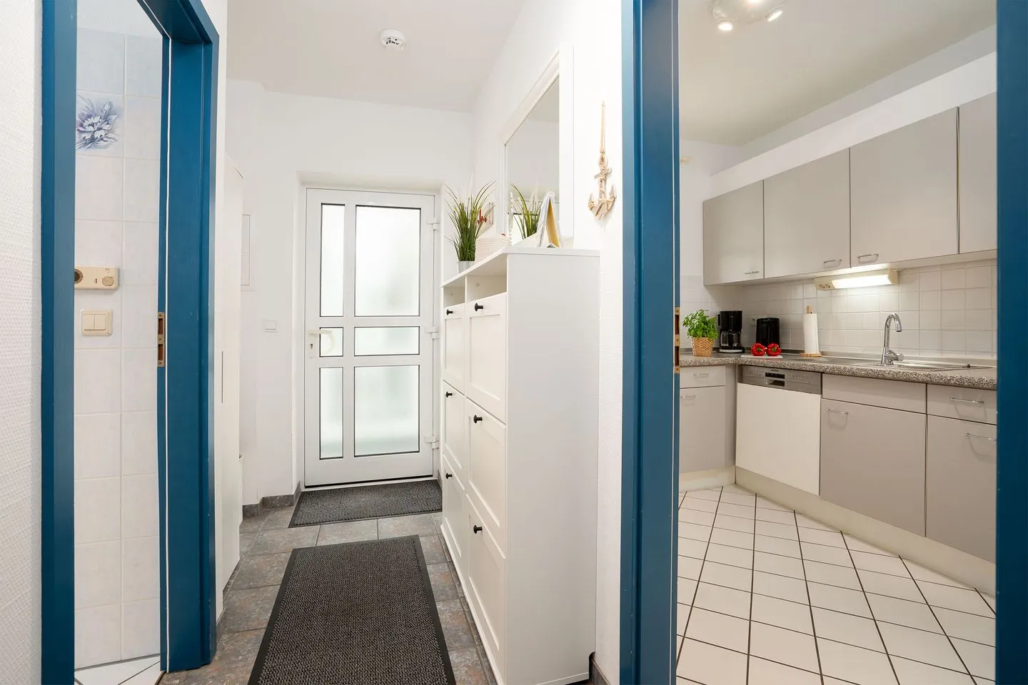 Ostseeallee 11, ca. 51 m², 1. Etage, Balkon mit eingeschränktem Meerblick, Wohnzimmer mit großer Schlafcouch, großzügige Essecke, TV, DVD-Player, WLAN, Musikanlage mit Radio und CD-Player, Schlafzimmer mit 2 Boxspring-Einzelbetten (Einstieghöhe 70 cm) und Vorhangschienen als Tür, Einbauküche mit Backofen, Geschirrspüler, Mikrowelle Filterkaffeemaschine, Toaster, 4-Platten-Herd, Kühlschrank mit Gefrierfach, Bad mit Badewanne / Dusche, WC, Föhn, Schuhschrank, Außenstellplatz, Fahrradkeller, 2 Kinderreisebetten, Bücher u. Spielsachen, Kinderessgeschirr ,Hochstuhl und Toilettentrainer, vorhanden, keine Haustiere, Bettwäsche und Handtücher bitte mitbringen oder spätestens zwei Tage vor Anreise gegen Gebühr bestellen.