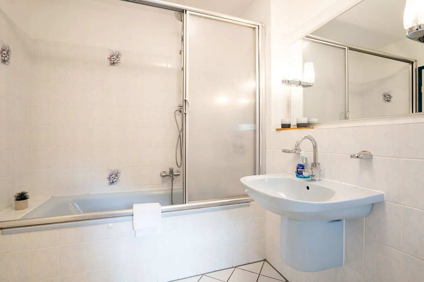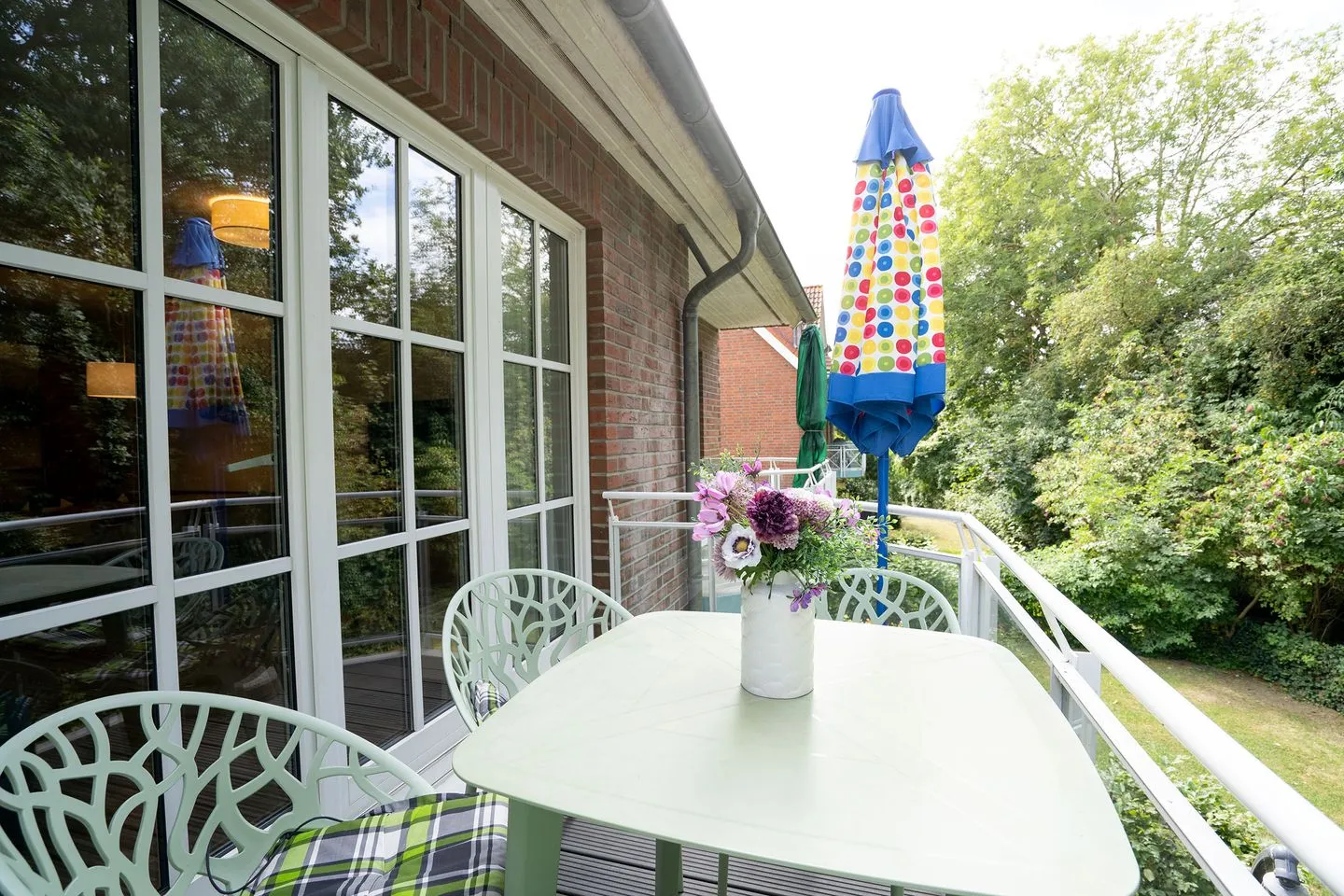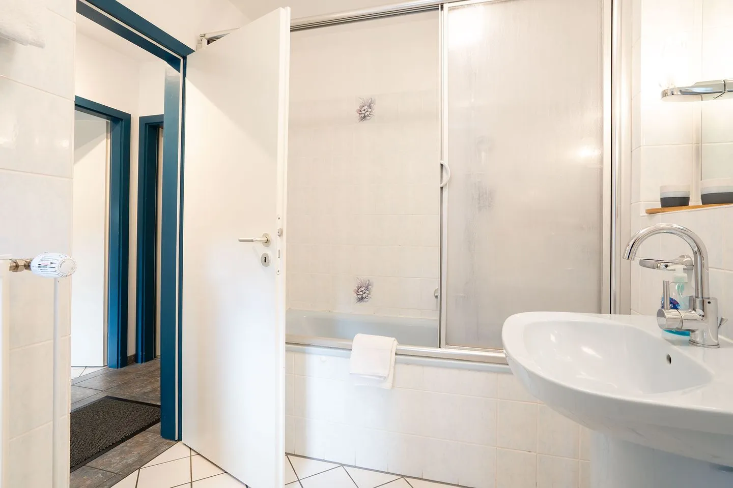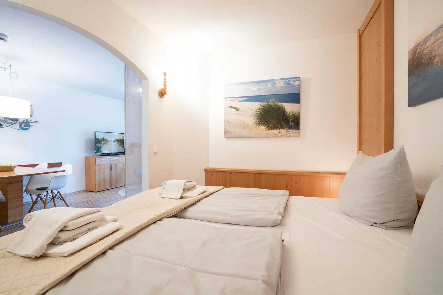 Ostseeallee 11, ca. 51 m², 1. Etage, Balkon mit eingeschränktem Meerblick, Wohnzimmer mit großer Schlafcouch, großzügige Essecke, TV, DVD-Player, WLAN, Musikanlage mit Radio und CD-Player, Schlafzimmer mit 2 Boxspring-Einzelbetten (Einstieghöhe 70 cm) und Vorhangschienen als Tür, Einbauküche mit Backofen, Geschirrspüler, Mikrowelle Filterkaffeemaschine, Toaster, 4-Platten-Herd, Kühlschrank mit Gefrierfach, Bad mit Badewanne / Dusche, WC, Föhn, Schuhschrank, Außenstellplatz, Fahrradkeller, 2 Kinderreisebetten, Bücher u. Spielsachen, Kinderessgeschirr ,Hochstuhl und Toilettentrainer, vorhanden, keine Haustiere, Bettwäsche und Handtücher bitte mitbringen oder spätestens zwei Tage vor Anreise gegen Gebühr bestellen.
